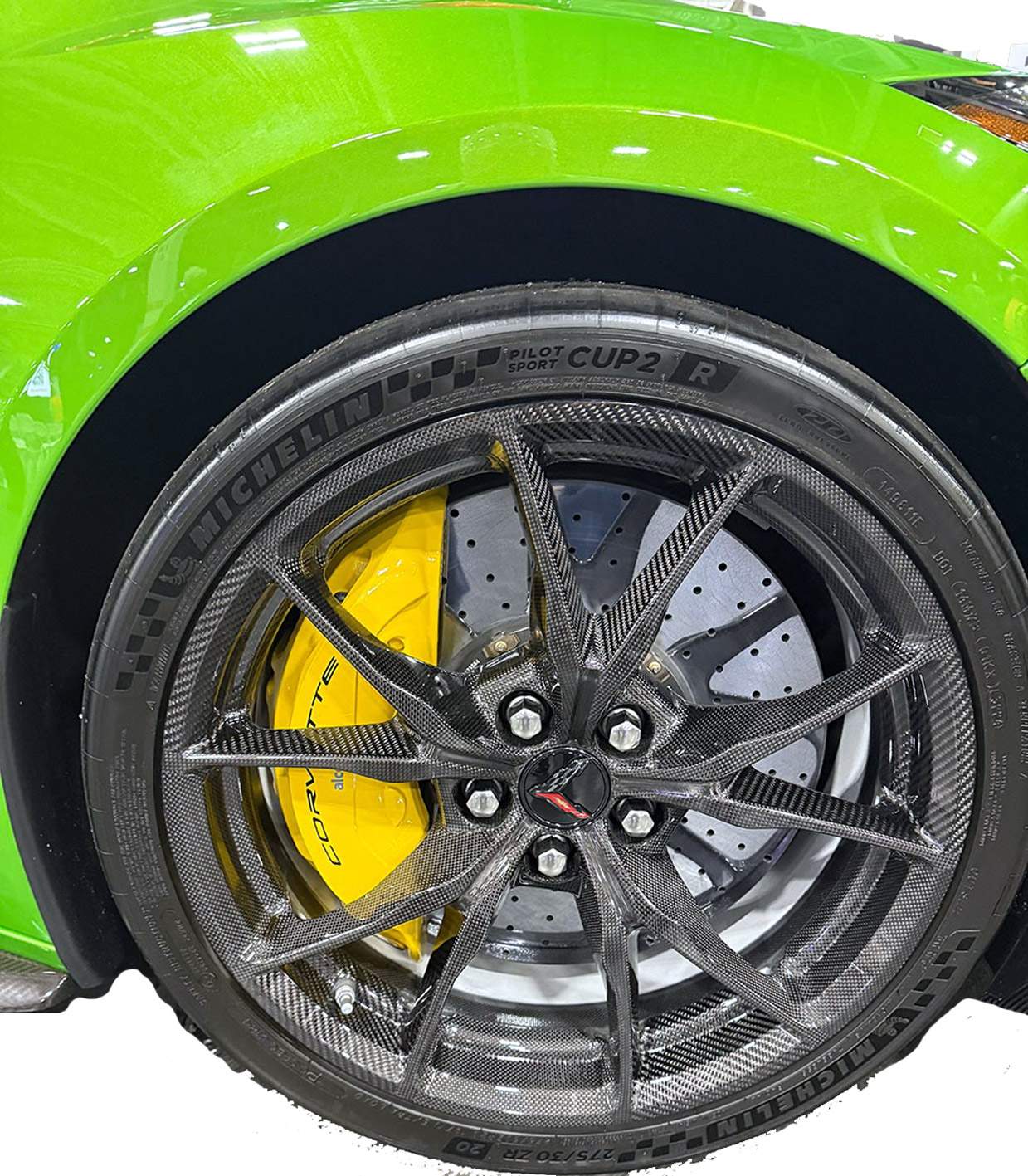 • Advanced Rotors: Braking force is applied to 16.5-inch front and rear carbon ceramic rotors, the largest diameter ever offered on a Corvette.