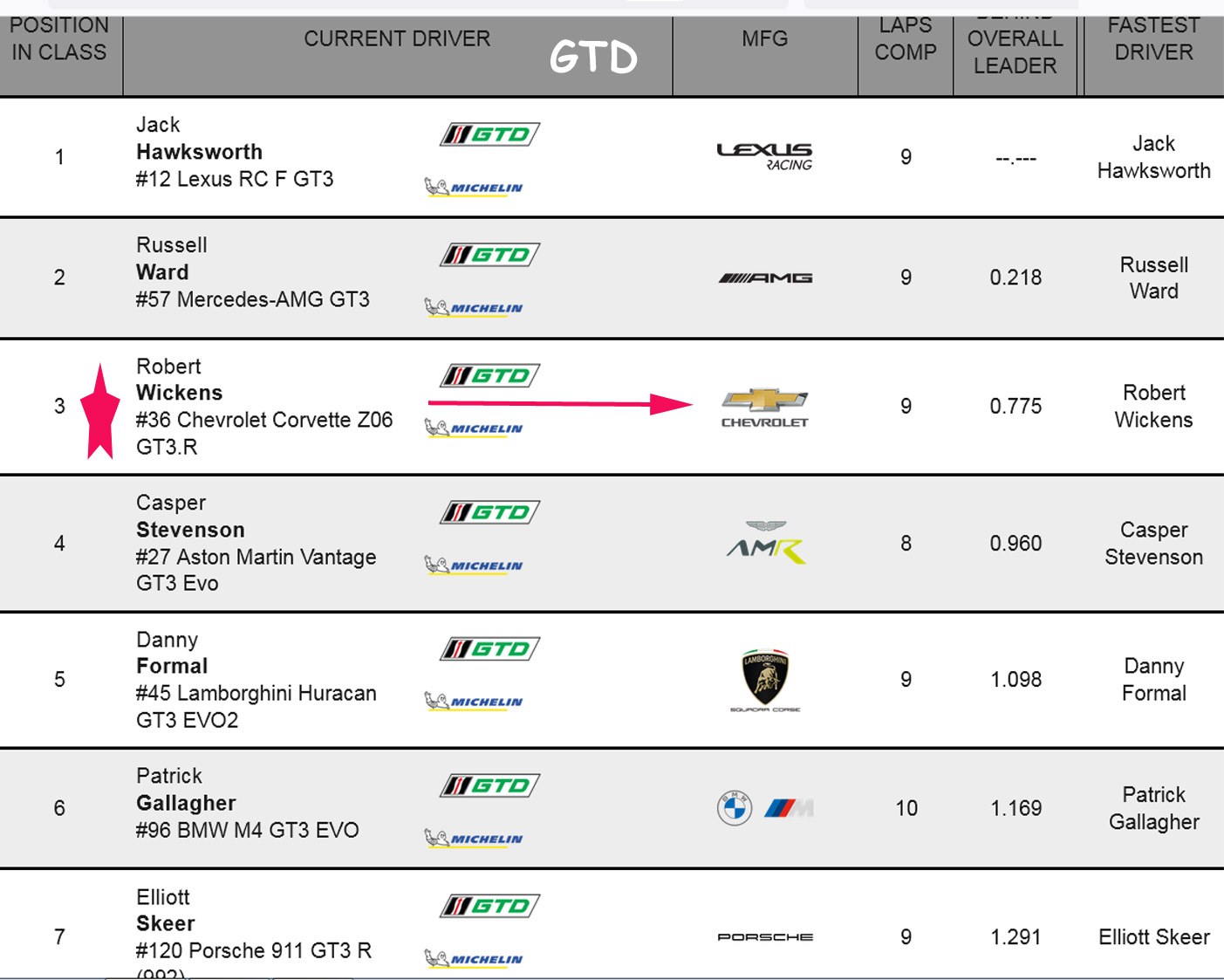 Robert Wickens set the third-quickest GTD time in his No. 36 DXDT Corvette ahead of Casper Stevenson’s No. 27 Heart of Racing Team Aston Martin Vantage GT3 Evo after the British team was stripped of its fastest qualifying time for causing a red flag in practice 2 earlier this afternoon.