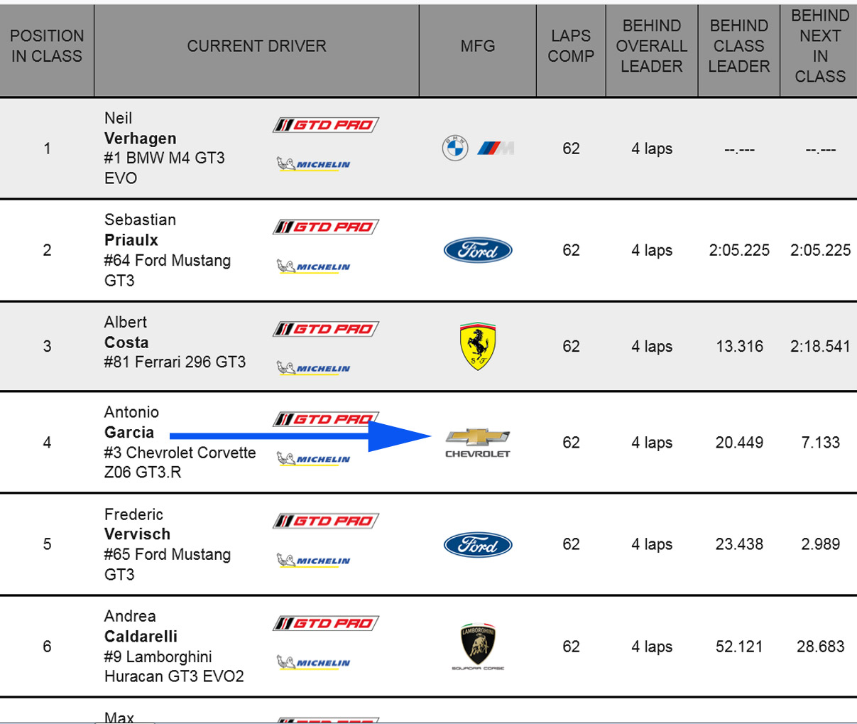 Antonio Garcia made a comeback drive to finish fourth in class in the No. 3 Corvette Racing by Pratt Miller Chevrolet Corvette Z06 GT3.R., which was in the Turn 1 gravel trap after contact from the No. 48 Paul Miller BMW of Dan Harper, who spun Alexander Sims to bring out the race’s fourth yellow on a restart. Harper was handed a drive-through penalty for incident responsibility.