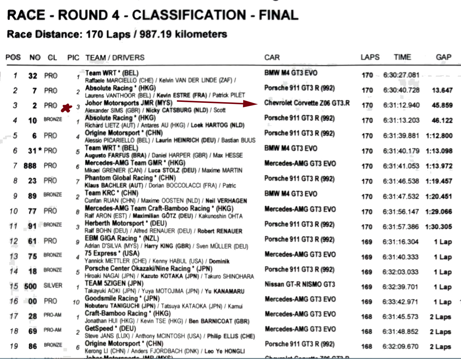 The No. 2 Johor Motorsports JMR Chevrolet Corvette Z06 GT3.R of Alexander Sims, Scott McLaughlin and Nicky Catsburg completed the overall and Pro class podium, despite a pre-race Balance of Performance hit. Catsburg was entrenched in a fierce battle with Buus as well as the No. 31 WRT BMW of Max Hesse with just over an hour to go, initially dropping to fifth before carving his way back to third before the final round of stops.