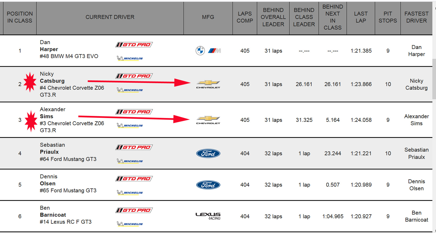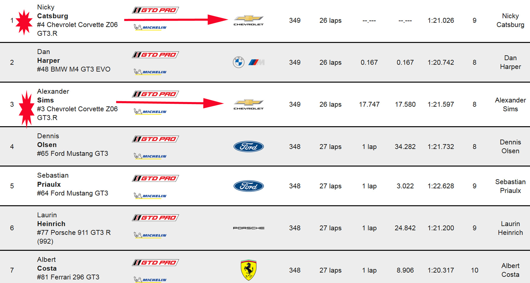 Tommy Milner, Nicky Catsburg and Nico Varrone placed second in class with their No. 4 Chevrolet Corvette Z06 GT3.R, just ahead of the GTD PRO Drivers Championship pairing of Antonio Garcia and Alexander Sims plus Daniel Juncadella in the No. 3 Corvette.