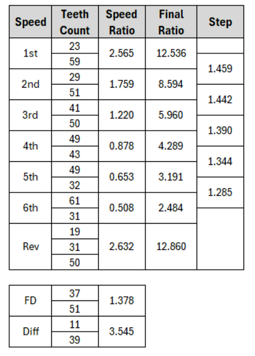 The gear ratios in this TREMEC aftermarket transaxle are different from a traditional manual transmission, because a transaxle combines the function (and overall gearing) of the transmission and the axle. After thorough research, the ratios were chosen to make the new transaxle compatible with the widest array of engines/power outputs and RPM ranges as possible. The result is a transaxle that can be used in a variety of builds and engine combinations.