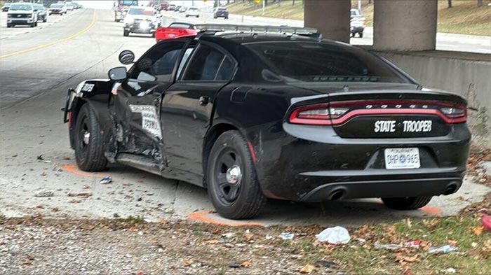 In the photos from the incident, the Dodge Charger patrol vehicle is showing heavy damage to its driver’s side door while the Corvette appears to have damage to the front of the car which came to rest against a concrete highway divider It also appears the passenger side airbag in the Corvette had deployed as well.