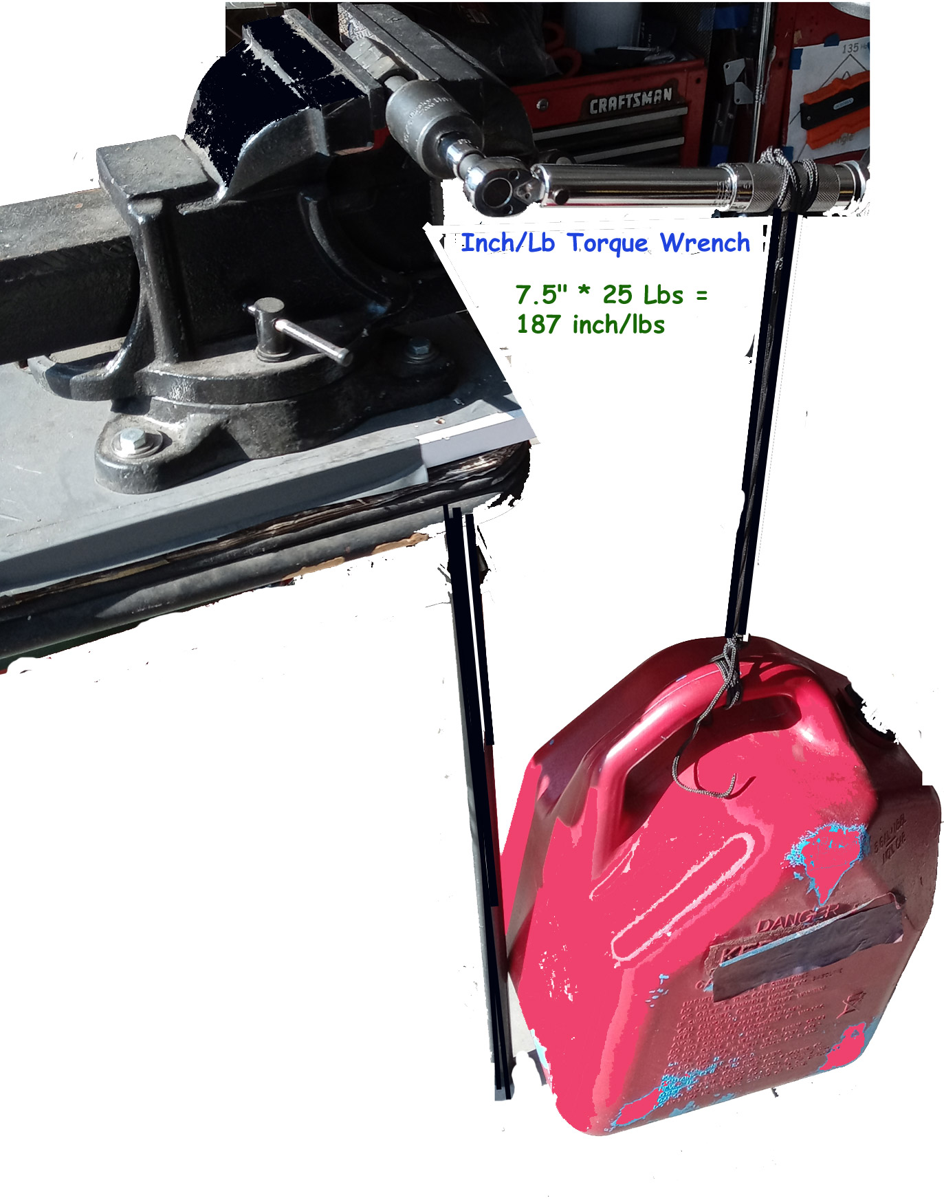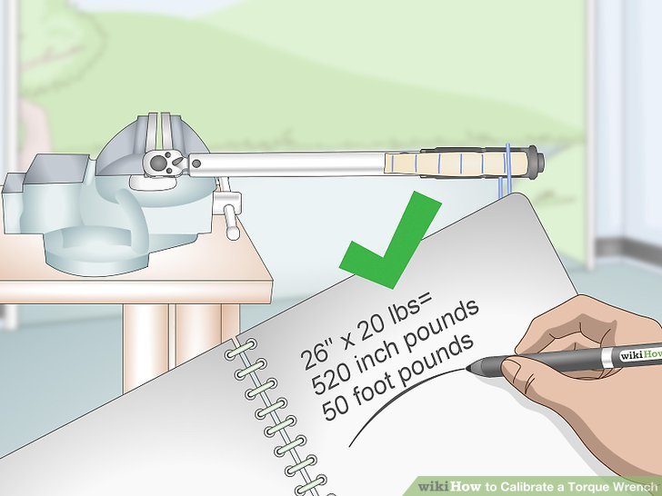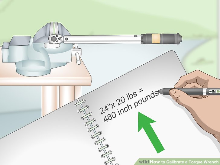 The equation is: handle distance times weight divided by 12. In order to determine the right setting for the torque wrench, multiply the distance you measured in step 2 by the 20 pounds you will be using for your weight. That comes out to 480 inch-pounds (24 inches times 20 pounds) which equates to 40 foot-pounds (480 inch-pounds divided by 12).