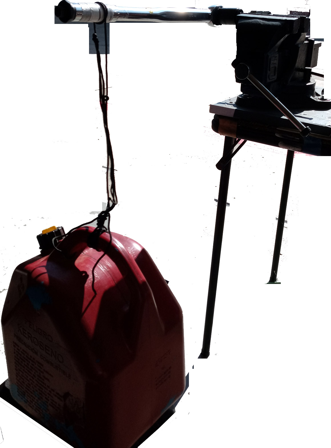 Orient your bench vice so you can place the square drive of the torque wrench into and have the handle extend out, away from the table or bench. Then insert the square drive into the vice and tighten it until it’s secure. • Be careful not to over tighten the vice and damage the square drive on the torque wrench. • Make sure only the square drive itself is caught in the clamp, so the wrench can move under the weight you apply.
