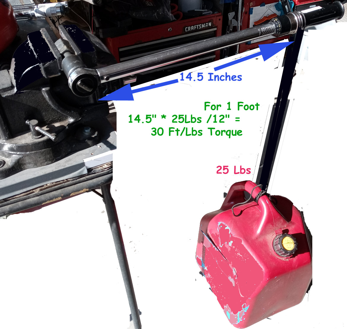 So 14.5 inches *25 pounds= 362 / 12 = 30 ft/lbs