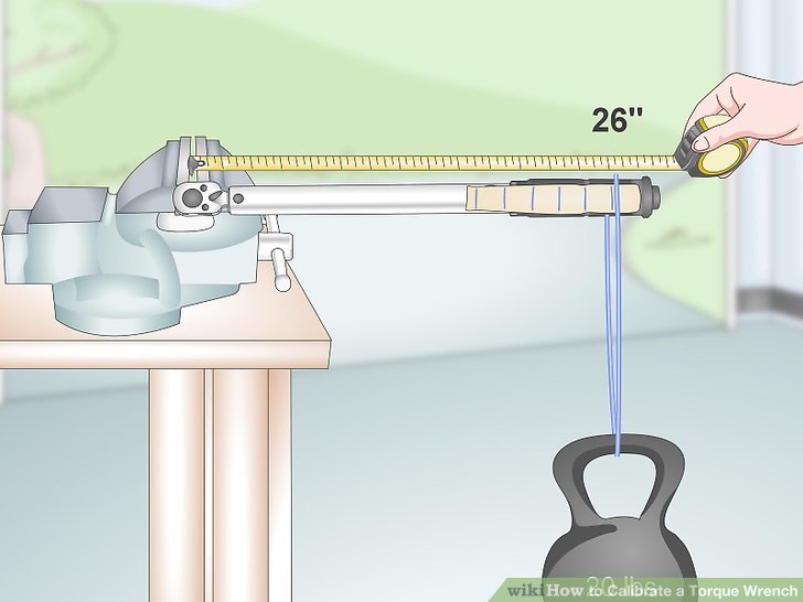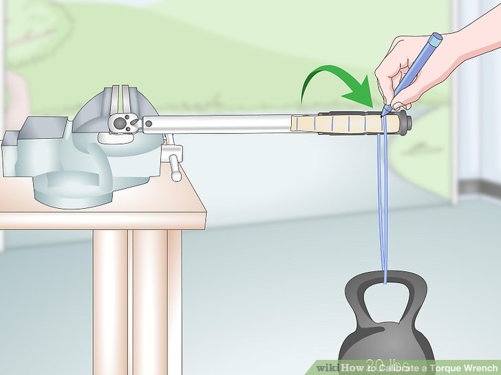 You can usually adjust the spring tension in a torque wrench by turning a screw located midway up the wrench’s handle with a screwdriver. Hang the 20 lb (9.1 kg) weight from the torque wrench at your first mark and see if it clicks. If it doesn’t, tighten the spring by turning the screw clockwise, then lift the weight and lower it again to test it.
